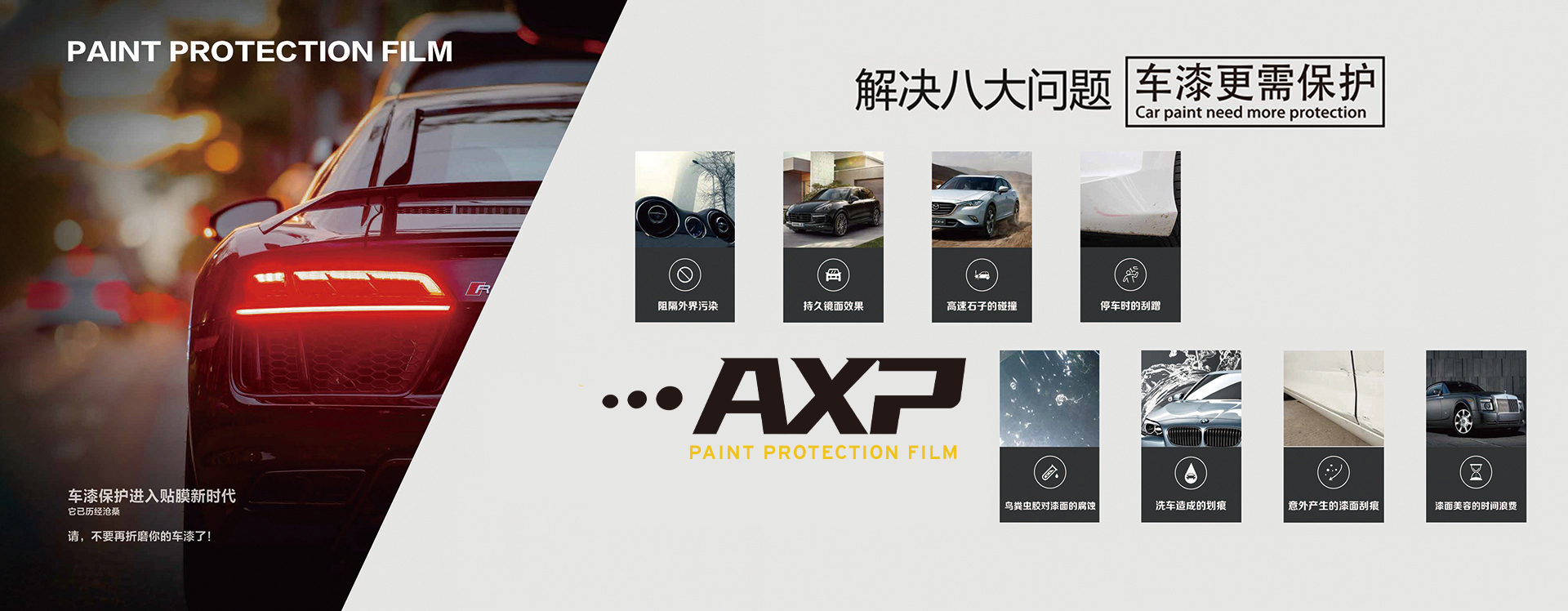 AXP漆面保护膜是一家集汽车漆面保护膜进出口贸易、生产为一体的公司。是最早专注汽车隔热膜,汽车隐形车衣产品开发、销售及服务于一体的专业企业之一,也是最早将美国顶尖科技的漆面保护膜引入中国市场的企业之一。